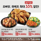 (뉴스와이어) 기름에 튀기지 않고 오븐에 구워 건강한 오븐에빠진닭(이하 오빠닭)이 소셜커머스 위메프와 프로모션을 한다.오빠닭은 자사 베스트 메뉴인 오리지날 로스트 치킨, 크리스피 베이크, 요거닭에 한해 정상가에서 최대 33%까지 할인된 가격으로 단 일주일간 위메프에서 만나볼 수 있도록 했다.이번 프로모션에서▲오븐에 구워 담백하고 부드러운 오빠닭 오리지날 로스트 치킨은 정상가인 14,900에서 33% 할인된 가격인 10,000원으로 ▲겉은 바삭 하지만 속은 촉촉한 육즙이 그대로 살아 있는 크리스피 베이크 치킨은 15,900원에서 31% 할인된 가격인 11,000원으로 만나볼 수 있으며 ▲순살베이크치킨에 달콤한 요거트 소스와 아이스크림을 함께 즐길 수 있어 여성들에게 인기 있는 치킨샐러드 요거닭은 19,900원에서 30%할인된 가격인 14,000원으로 즐길 수 있다.프로모션 기간은 12월 14일부터 20일까지이며. 구입한 이후에는 2016년 1월 31일까지 오빠닭 전 지점에서 사용할 수 있다. (일부 매장 제외)한편 오빠닭 가맹문의는 전화 (080-870-1003)와 공식 홈페이지(www.oppadak.co.kr)를 통해 확인 가능하다.출처: 에땅홈페이지: ht