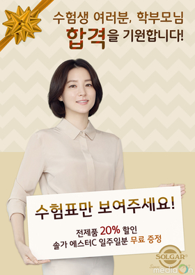 (뉴스와이어) 한국솔가㈜(대표 김용을)가 2016학년도 대학수학능력시험 수험생과 학부모를 위해 13일부터 백화점 전국 매장에서 ‘수능 합격 기원 이벤트’를 진행한다.솔가의 ‘수능 학격 기원 이벤트’는 매장에 수험표를 지참한 수험생 및 학부모에게 솔가 에스터C 7정을 선물로 증정하며, 제품 구매 시 모든 제품을 20% 할인된 가격에 구매할 수 있는 있다. 또한 회원 가입 시 가입비 10,000원 전액 면제 혜택도 함께 주어진다.이번 이벤트는 오랜 수험생활로 몸과 마음이 지친 수험생은 물론 함께 고생한 부모님을 위해 전 제품 할인 이벤트를 기획되었으며 비타민C·비타민B·클로렐라·종합비타민까지 자신의 건강상태에 필요한 영양소를 선택할 수 있다.특히 이영애 비타민으로 유명한 ‘솔가 에스터C’는 높은 흡수율과 속쓰림 없는 중성 비타민으로 공복에도 위장장애 없이 섭취가 가능하다. 또한 에스터C는 비타민C 제재로는 유일하게 미국 특허 받은 원료로 체외 배출이 적기 때문에 요로결석이나 신장결석에 대한 우려가 적은 것이 주요 특징이다.한국솔가㈜ 마케팅팀 담당자는 “수능을 준비하기 위해 오랜 시간 고생한 수험생은 물론 함께 수고한 학부모를 격려하기 위해 이번 이벤트를 마련했다